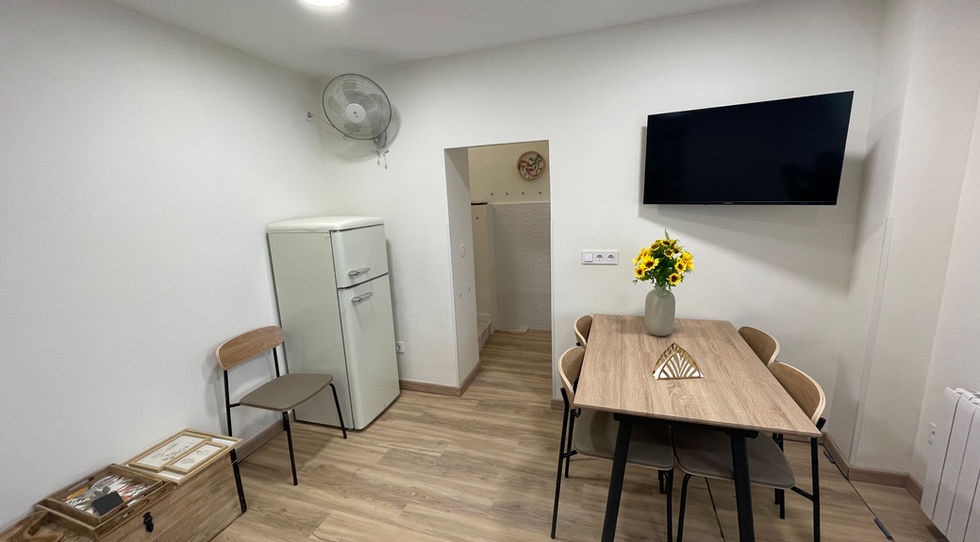 En la planta baja encuentras el salón comedor con sofá y mesa ampliable con un total de 6 sillas. También una pequeña cocina con todo lo necesario.